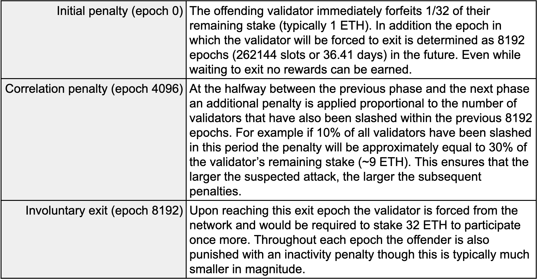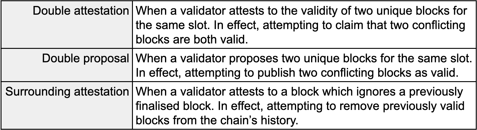To maintain the reliability and security of Ethereum there is a reliance on over two-thirds of all active validators to be honest. Motivating such honesty is the responsibility of carefully devised rewards and risks for validators. While participating in the network would typically return profitable yields, malicious actions, including double spend attacks, require consequences. This concept is referred to as slashing and involves losing access to a significant portion of a validator’s initial stake (32 ETH that one must invest to be allowed to participate in the network). Throughout this article explanation will be given to what exactly constitutes a slashable offence and the precise effect of being slashed. Importantly it will also be explained how slashing can inadvertently punish validators not intending to act maliciously and how these circumstances can be avoided.