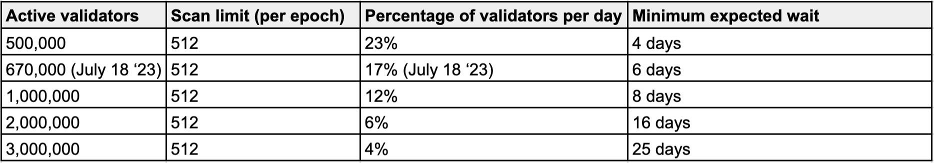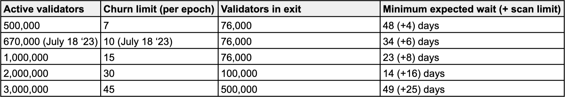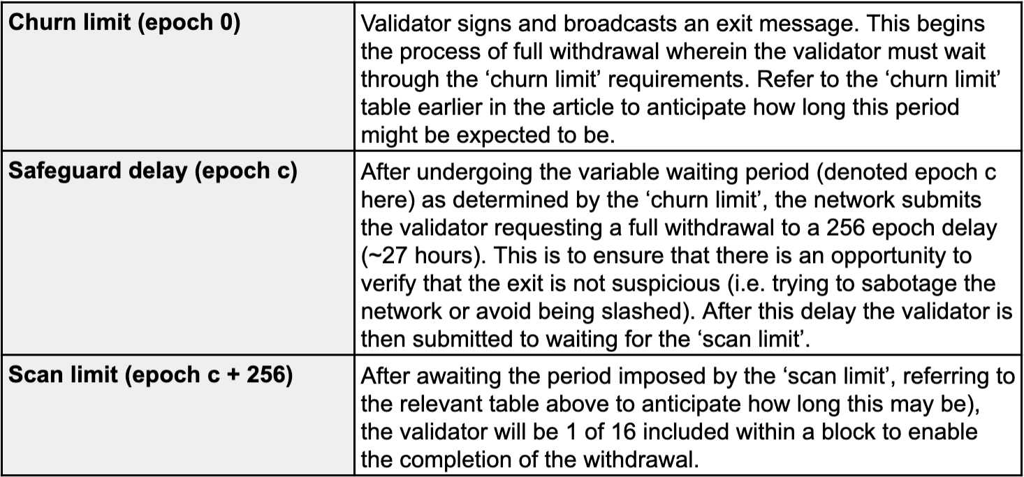 Churn limits only apply to full withdrawals where all stake and yield is retrieved. Partial withdrawals, where only yield is retrieved, are not restricted by this guarantee, but are instead fixed to a static 16 validators per slot (32 slots in an epoch). We have denoted this as a “scan limit” within this article for the purposes of clarity.