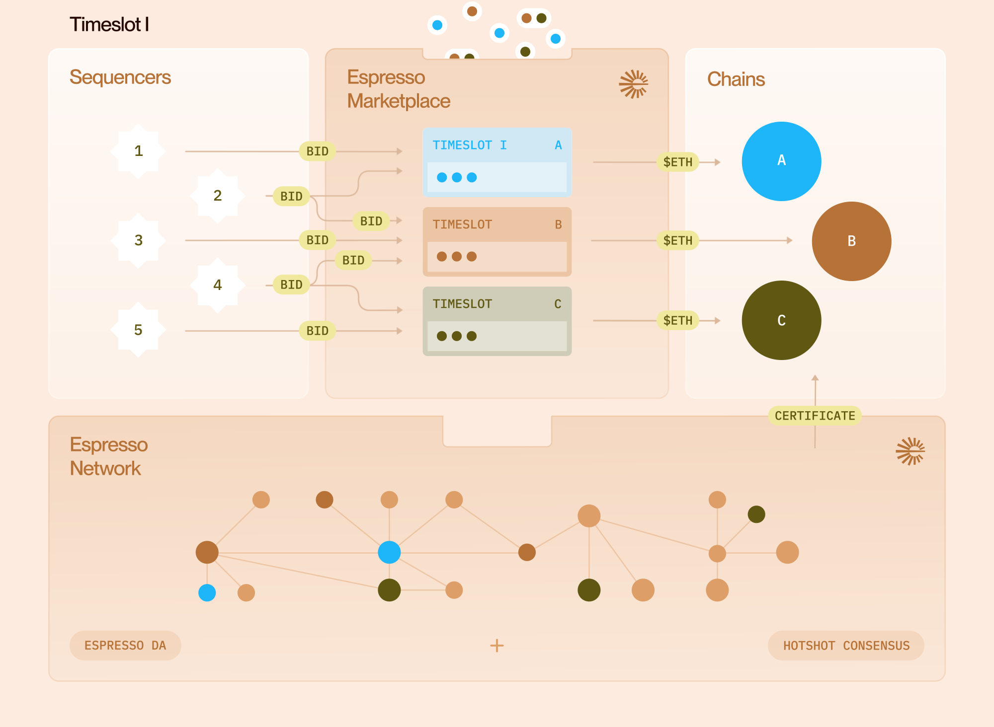 Espresso’s solution consists of the Espresso Marketplace and the Espresso Network. Both are in service of greater interoperability, decentralisation, and efficiency. The Espresso Marketplace is a venue where chains, like L2 rollups, can sell the right to sequence transactions for them for a given period of time. Chains sell these “sequencing rights” to specialised actors like block builders that order transactions. These sequencers can order transactions for multiple chains at once, enabling coordinated block building and an improved interoperability experience for users. The marketplace is designed so that chains capture at least as much revenue as they would running their own centralised sequencer.